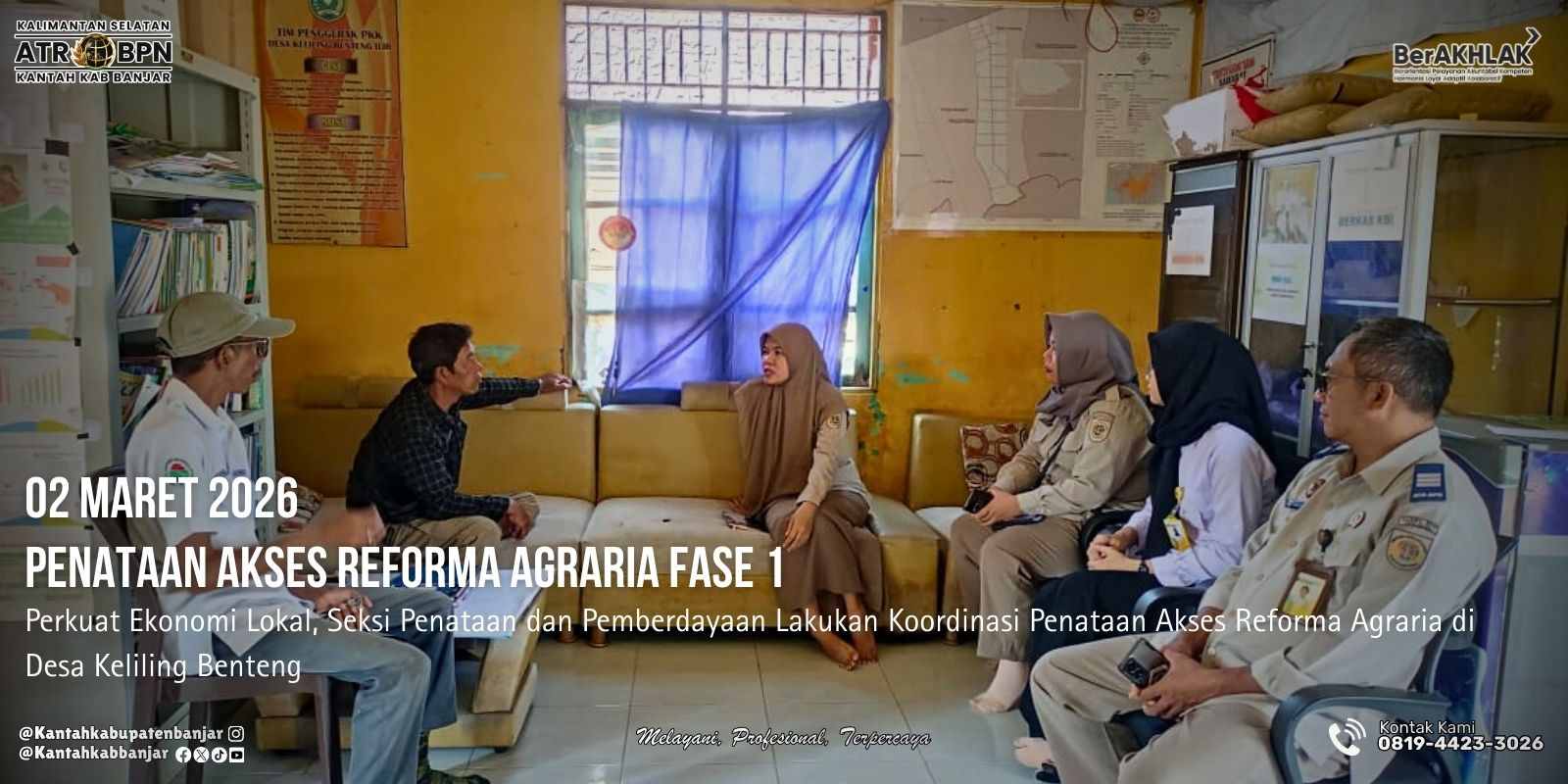 Kata Banua, Martapura – Dalam upaya mendorong kesejahteraan masyarakat melalui pemanfaatan lahan yang optimal, Seksi Penataan dan Pemberdayaan Kantor Pertanahan telah melaksanakan kegiatan koordinasi untuk penentuan lokasi kegiatan Penataan Akses Reforma Agraria Fase 1 Tahun Anggaran 2026.