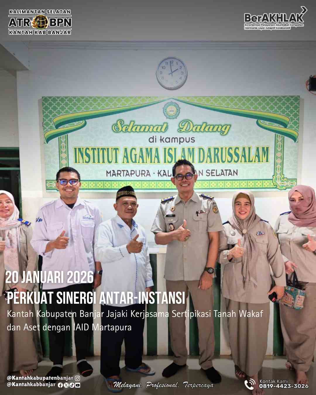 Kata Banua, Martapura – Kantor Pertanahan Kabupaten Banjar melakukan langkah proaktif dalam meningkatkan pelayanan publik dan pengamanan aset negara melalui inisiasi kerjasama dengan Institut Agama Islam Darussalam (IAID) Martapura. Kegiatan koordinasi ini merupakan tindak lanjut dari surat permohonan kerjasama yang diajukan oleh Kepala Kantor Pertanahan Kabupaten Banjar, Langlang Tresna Permagati, S.SiT., M.H. Selasa (20/1/2026)