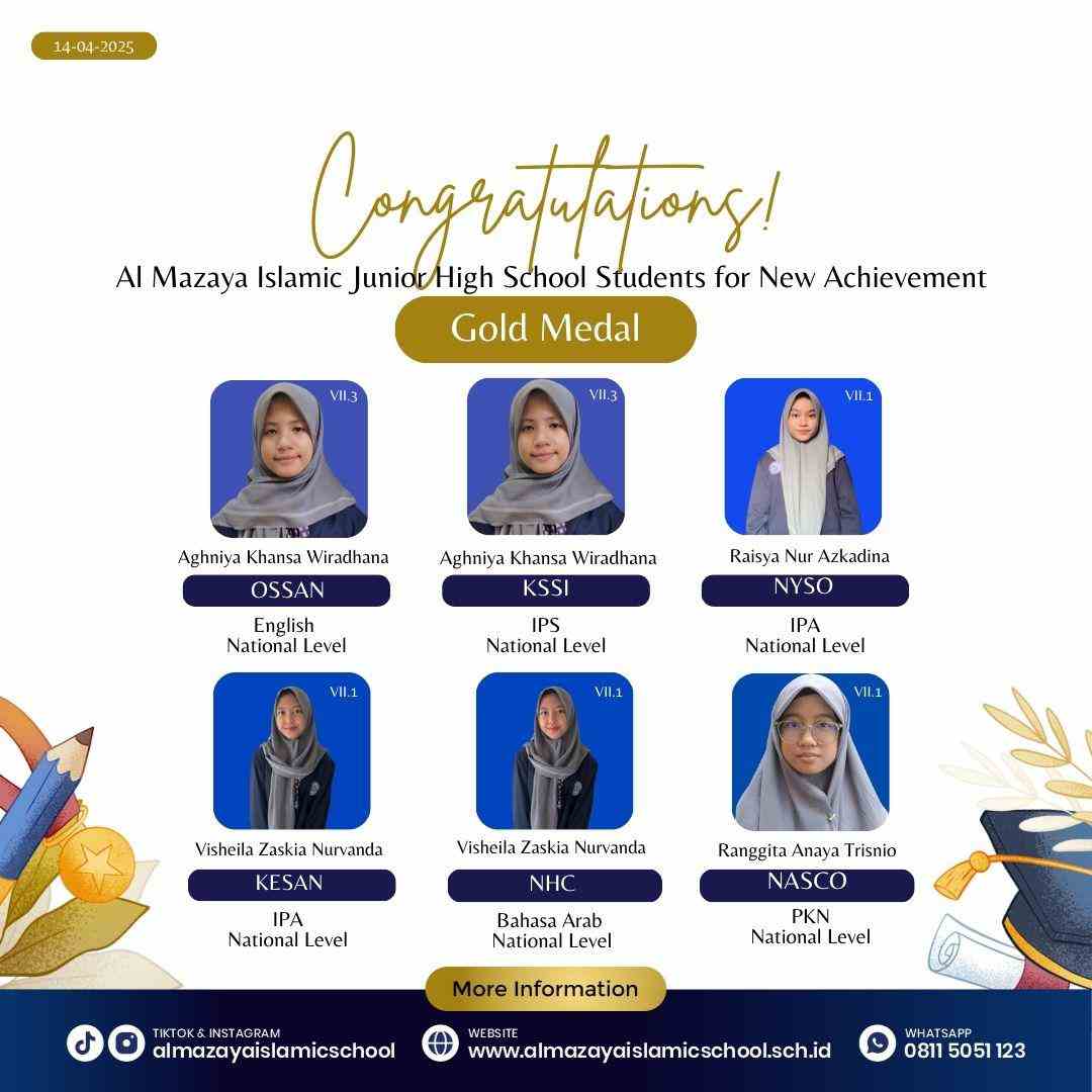 – Raisya Nur Azkadina (Kelas 7) memboyong **satu medali emas** di NYSO IPA dan **dua medali perak** di NYSO Bahasa Indonesia.